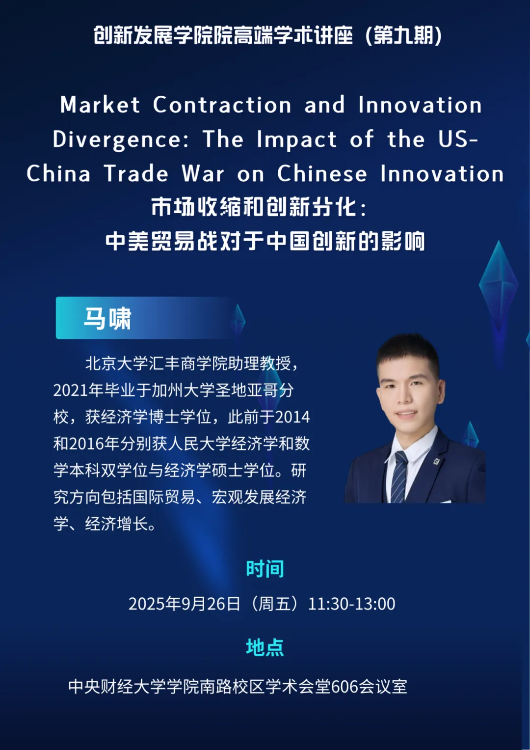 yl23411永利集团高端学术讲座(第九期),理悦CEMA•知与行系列研讨会2025年第1讲将于9月26日(周五)11:30-13:00在学术会堂606会议室举行,由北京大学汇丰商学院的马啸老师报告“市场收缩和创新分化:中美贸易战对于中国创新的影响”,欢迎感兴趣的师生(尤其是对科研有兴趣的本科生、硕士生和博士生)参加。