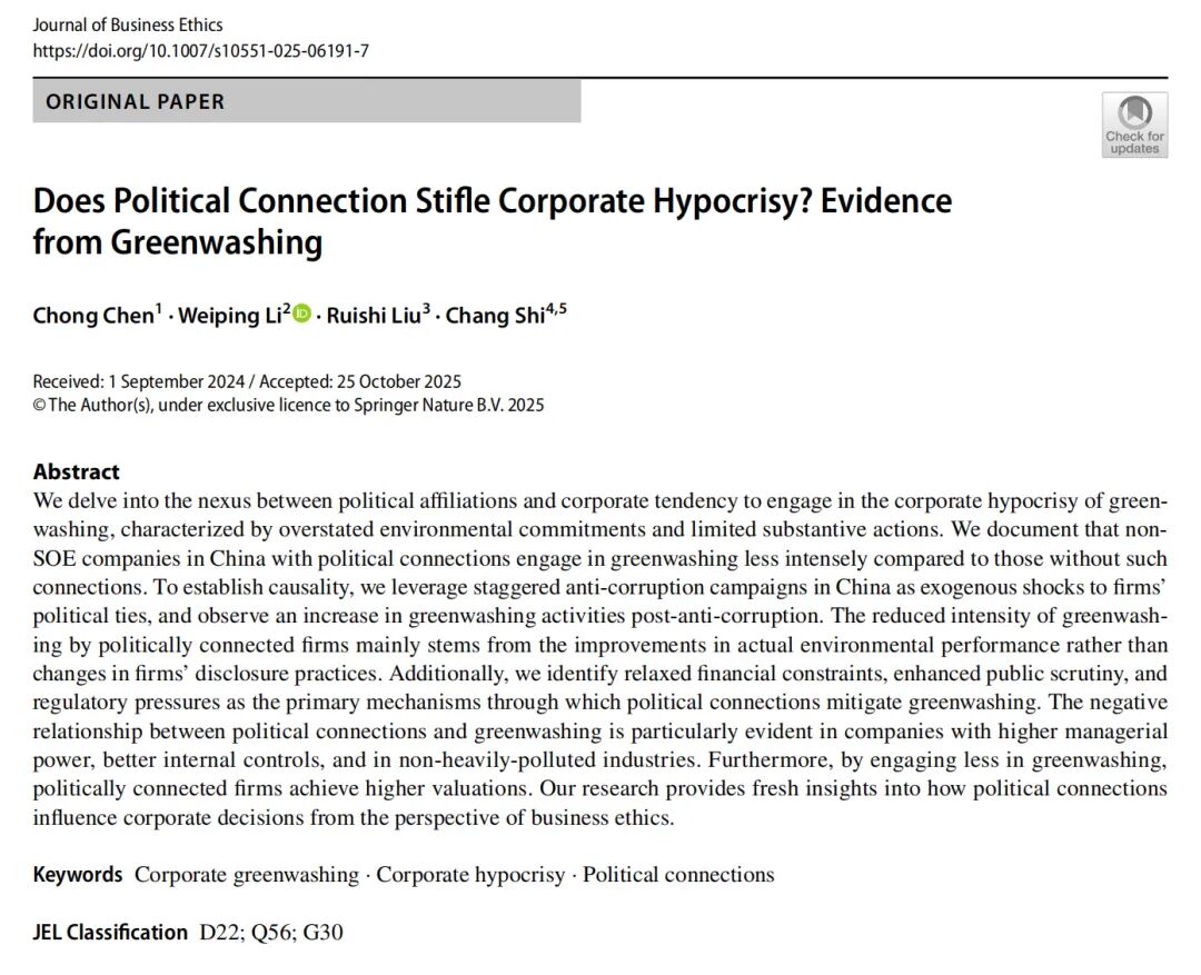 近日,我院陈翀副教授的研究论文“Does Political Connection Stifle Corporate Hypocrisy? Evidence from Greenwashing”于国际商学高水平期刊Journal of Business Ethics(FT50,中财AA类)上获在线发表。该论文的合作者还有澳门城市大学金融学院李伟平副教授,上海对外经贸大学金融管理学院施畅助理教授,以及香港大学经管学院研究生刘睿诗。该研究获得陈翀副教授所主持的国家自然科学基金青年项目(项目编号: 72102245)以及yl23411永利“菁英学者”支持计划(项目编号: JYXZ2411)的资助。