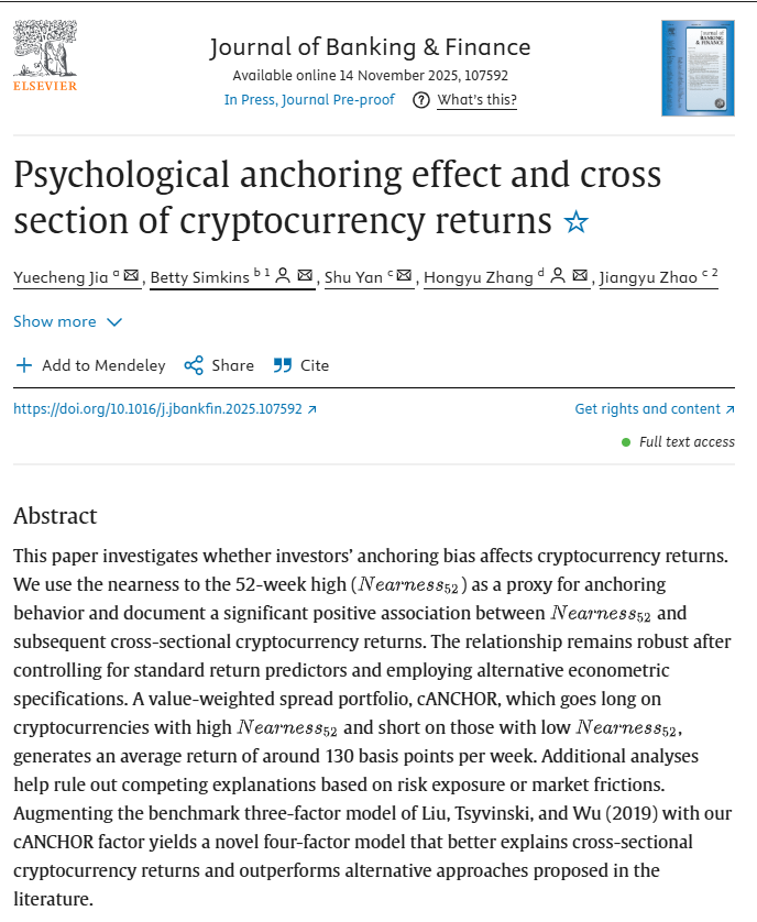 近日,我院贾越珵副教授的论文“Psychological anchoring effect and cross section of cryptocurrency returns”在金融领域的国际权威期刊Journal of Banking and Finance(ABS 3,中财AA类)正式发表。该论文的合作者为yl23411永利商学院张宏宇教授、Oklahoma State University的Betty Simkins教授、阎澍教授、以及该校博士生赵姜宇同学。其中,赵姜宇同学是我院2023届硕士毕业生,在读期间导师为贾越珵副教授。