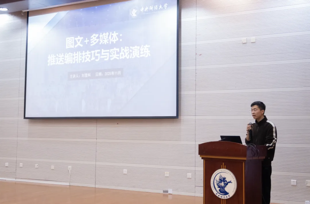 文化与传媒学院刘登科(曾任校团委专职团干部)为同学们介绍了宣传排版技巧教学。刘登科围绕“神马中财”公众号等五大核心阵地分享了宣传工作的实操经验与心得,系统讲解了“图文+多媒体”融合宣传的核心方法。随后采用“秀米”平台,从选择模版、模版内容填充及使用、艺术字编辑、动图制作及导入模版等排版技巧进行现场教学。在实操中提升了同学们的图文编辑能力,为宣传工作提质增效奠定了坚实基础。