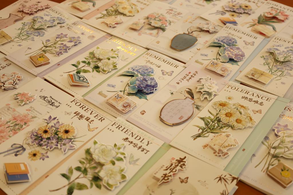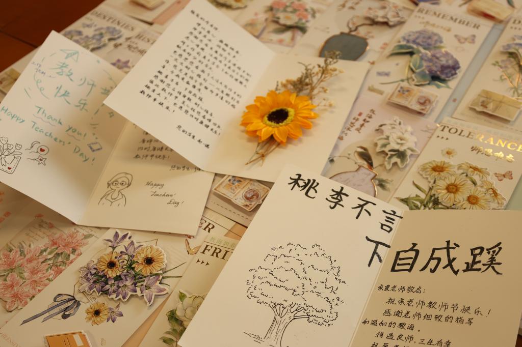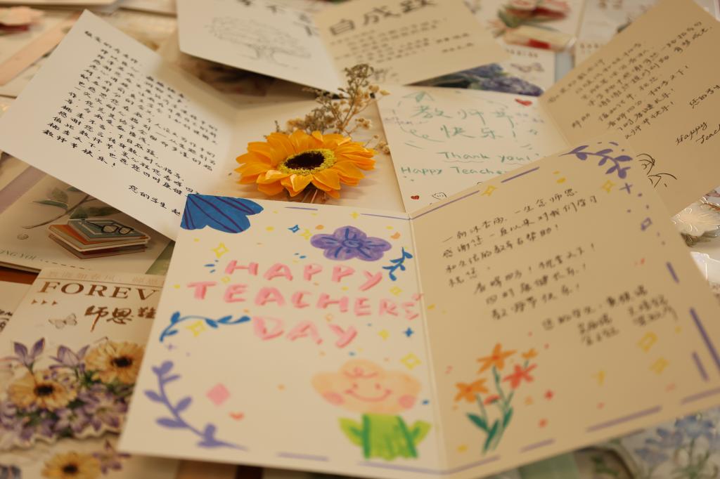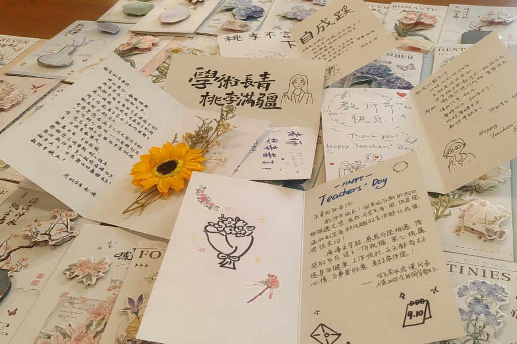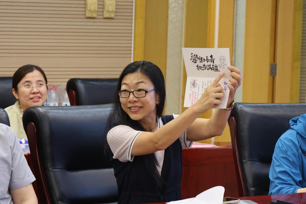 9月10日上午,全体教师步入会场时,都收到了学院准备的定制贺卡。每一张都由学生亲手设计书写,跃动着青春的笔触与心跳。老师们分享了贺卡内容,满溢青春的感恩与教育的温度。