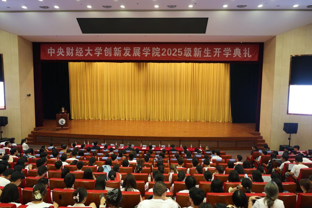 中国金融发展研究院2025级本科生王宇凡代表本科新生发言。他回顾自开学以来的种种经历,指出他从中感受到了中财大的热情与温暖。他表示,大家应当共怀“经世济民”的理想抱负,将青春融入财经报国的浪潮。在未来勤学笃行,努力成为专业领域的探索者,走向世界的创新者。
