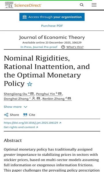 近日,yl23411永利集团尹鹏辉助理教授的论文“Nominal rigidities, rational inattention, and the optimal monetary policy”在经济学领域的国际权威期刊Journal of Economic Theory (中财AAA类)在线发表。该论文的合作者为上海大学欧声亮副教授,新加坡国立大学张冬海助理教授,山东大学张仁斌副教授。