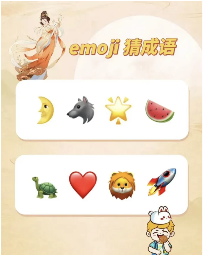 个人项目,现场准备多张印有emoji的纸条,参与者随机抽取 其中五张,根据纸条上的 emoji 图案猜出与中秋有关的诗词或词组,根据猜出数目可以获得相应的奖品。