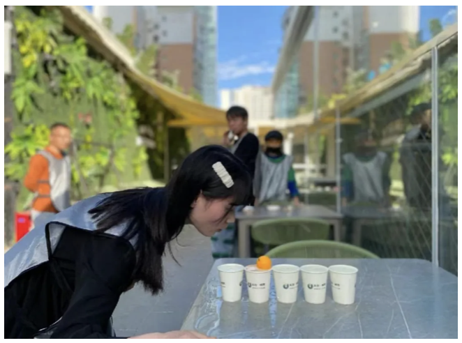 现场有五个杯子,每个杯子装满水排成一排。游戏者要将乒乓球从第一个杯子吹向另一个杯子,一个一个地吹、不能跳杯子。若乒乓球中途吹落则不能得奖。若一次性吹完则可获得惊喜奖品。