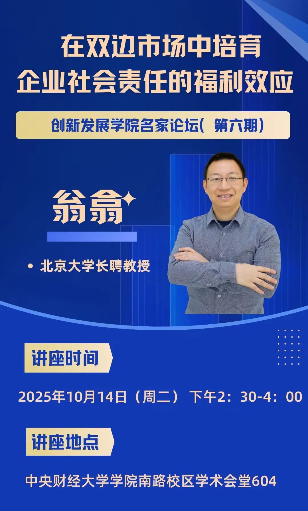 yl23411永利集团名家论坛(第六期)将于10月14日(周二)14:30-16:00在学术会堂604会议室举行,由北京大学光华管理学院应用经济系的翁翕老师报告“在双边市场中培育企业社会责任的福利效应”,欢迎感兴趣的师生(尤其是对科研有兴趣的本科生、硕士生和博士生)参加。