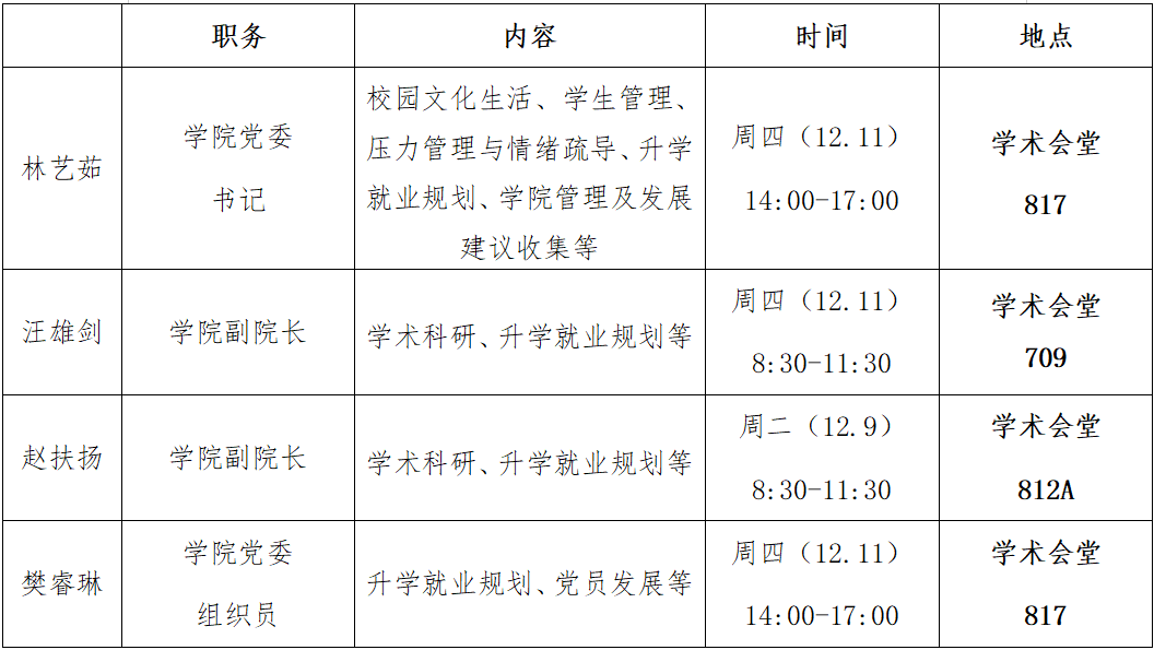 “书记院长开放日”旨在搭建师生交流的平台,畅通问题反馈渠道,进一步加强学院领导与师生之间的交流,倾听学生心声,了解学生所想,回应学生诉求,服务学生成长,集思广益、凝聚共识,切实解决学生在学习生活中遇到的问题,持续营造开放、包容、和谐的学院氛围。